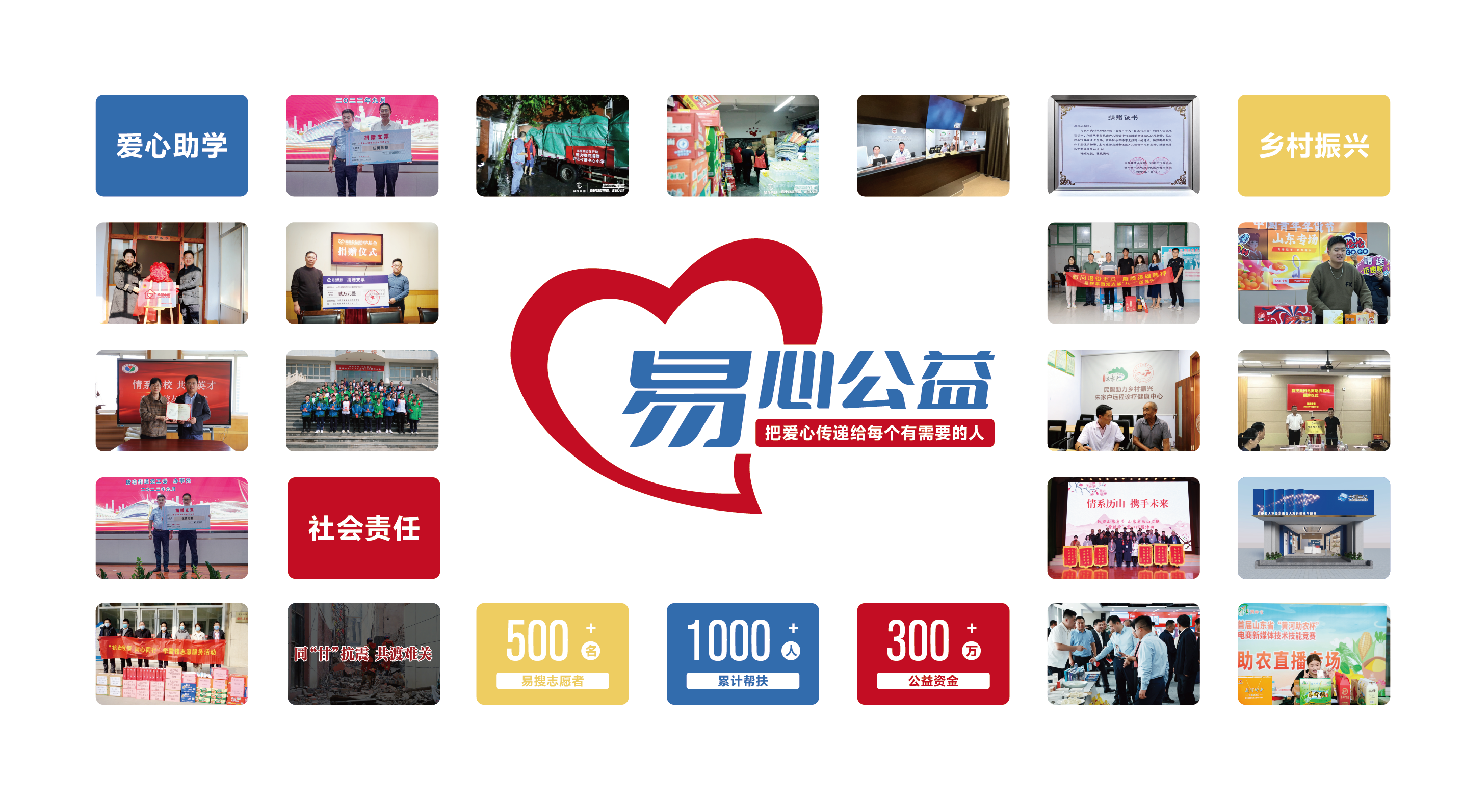 注重自身发展,真诚回报社会。2015年在共青团山东省委的大力支持下,集团创立“易心公益”品牌,2019年成立“易心公益基金”,由易搜员工自发500余名志愿者,累计帮扶社会残障、受困群众、贫困家庭、孤寡老人达千余人,捐助救灾物资近300万元。